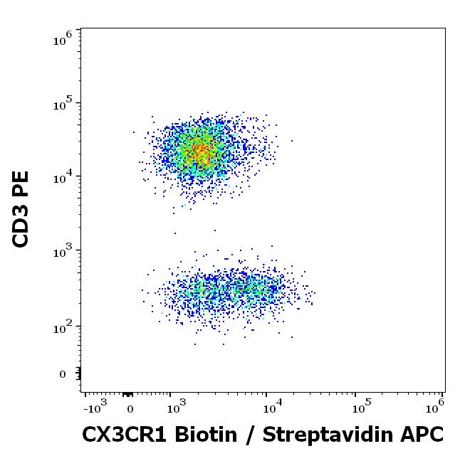 Flow cytometry multicolor surface staining pattern of human peripheral whole blood stained using anti-human CD3 (UCHT1) PE antibody (20 μl reagent / 100 μl of peripheral whole blood) and anti-human CX3XR1 (2A9-1) biotin antibody (concentration in sample 5 μg/ml, Streptavidin APC).