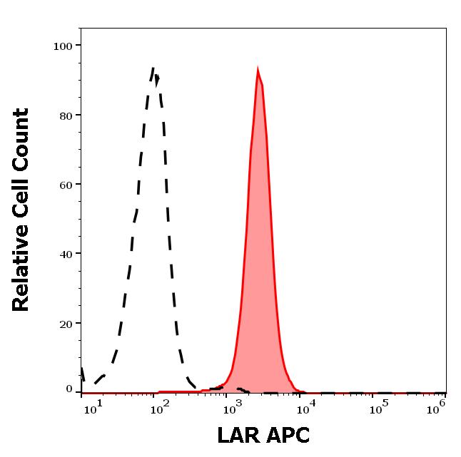 Separation of HeLa cells stained using anti-human LAR (W7C6) APC antibody (concentration in sample 1,7 μg/ml, red-filled) from HeLa cells stained using mouse IgG1 isotype control (MOPC-21) APC antibody (concentration in sample 1,7 μg/ml, same as LAR APC concentration, black-dashed) in flow cytometry analysis (surface staining) of HeLa cell suspension.