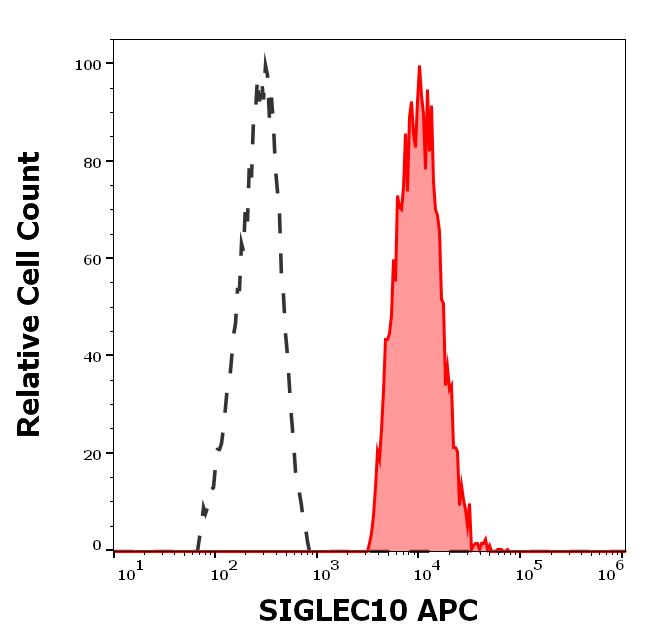 Separation of human SIGLEC10 positive non-classical monocytes (red-filled) from SIGLEC10 negative lymphocytes (black-dashed) in flow cytometry analysis (surface staining) of human peripheral whole blood stained using anti-human SIGLEC10 (5G6) APC antibody (10 μl reagent / 100 μl of peripheral whole blood).