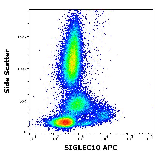 Flow cytometry surface staining pattern of human peripheral whole blood stained using anti-human SIGLEC10 (5G6) APC antibody (10 μl reagent / 100 μl of peripheral whole blood).