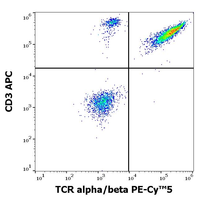 Flow cytometry multicolor surface staining of human lymphocytes stained using anti-human TCR alpha/beta (IP26) PE-Cy™5 antibody (4 μl reagent / 100 μl of peripheral whole blood) and anti-human CD3 (UCHT1) APC antibody (10 μl reagent / 100 μl of peripheral whole blood).