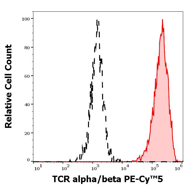 Separation of human TCR alpha/beta positive lymphocytes (red-filled) from TCR alpha/beta negative lymphocytes (black-dashed) in flow cytometry analysis (surface staining) of human peripheral whole blood stained using anti-human TCR alpha/beta (IP26) PE-Cy™5 antibody (4 μl reagent / 100 μl of peripheral whole blood).