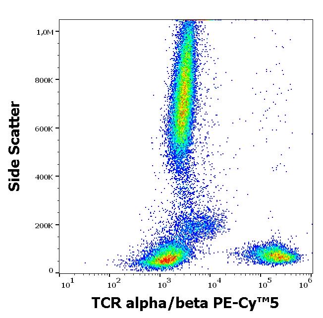 Flow cytometry surface staining pattern of human peripheral whole blood stained using anti-human TCR alpha/beta (IP26) PE-Cy™5 antibody (4 μl reagent / 100 μl of peripheral whole blood).