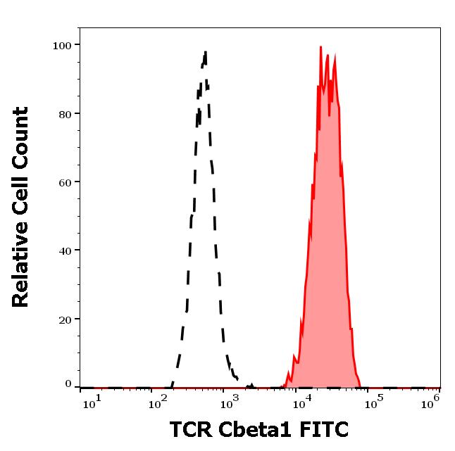 Separation of human TCR Cbeta1 positive T cells (red-filled) from TCR Cbeta1 negative lymphocytes(black-dashed) in flow cytometry analysis (surface staining) of human peripheral whole blood stained using anti-human TCR Cbeta1 (JOVI.1) FITC antibody (4 μl reagent / 100 μl of peripheral whole blood).