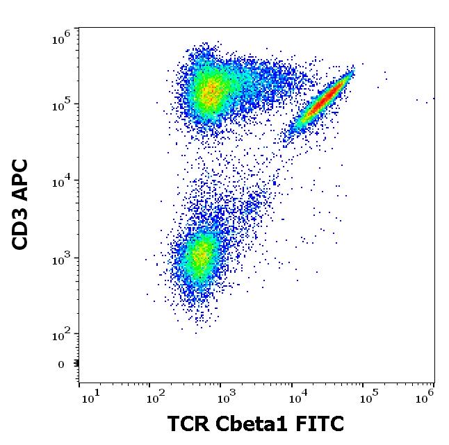 Flow cytometry multicolor surface staining of human lymphocytes stained using anti-human TCR Cbeta1 (JOVI.1) FITC antibody (4 μl reagent / 100 μl of peripheral whole blood) and anti-human CD3 (UCHT1) APC antibody (10 μl reagent / 100 μl of peripheral whole blood).