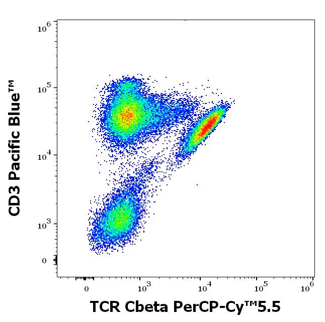 Flow cytometry multicolor surface staining pattern of human lymphocytes using anti-human TCR Cbeta1 (JOVI.1) PerCP-Cy™5.5 antibody (4 μl reagent / 100 μl of peripheral whole blood) and anti-human CD3 (UCHT1) Pacific Blue™ antibody (4 μl reagent / 100 μl of peripheral whole blood).