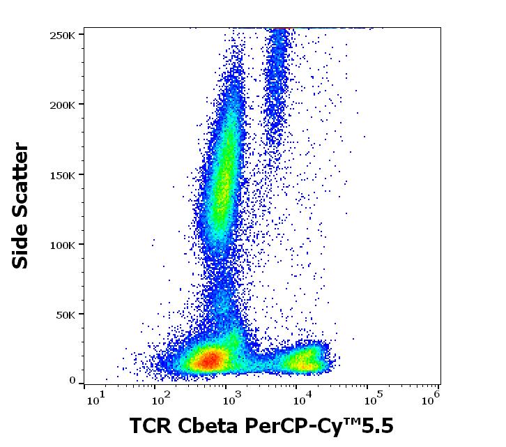 Flow cytometry surface staining pattern of human peripheral whole blood stained using anti-human TCR Cbeta1 (JOVI.1) PerCP-Cy™5.5 antibody (4 μl reagent / 100 μl of peripheral whole blood).