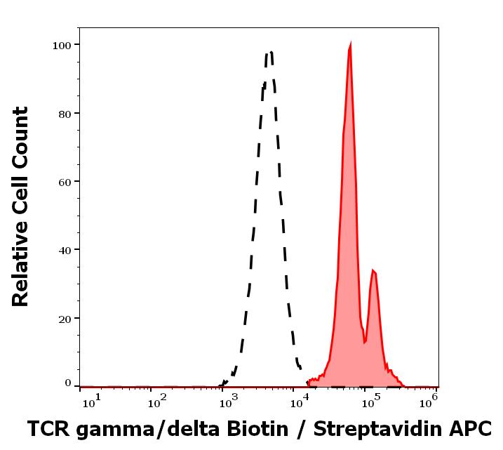 Separation of human TCR gamma/delta positive CD3 positive lymphocytes (red-filled) from TCR gamma/delta negative CD3 negative lymphocytes (black-dashed) in flow cytometry analysis (surface staining) of human peripheral whole blood stained using anti-human TCR gamma/delta (B1) Biotin antibody (concentration in sample 15 μg/ml, Streptavidin APC).