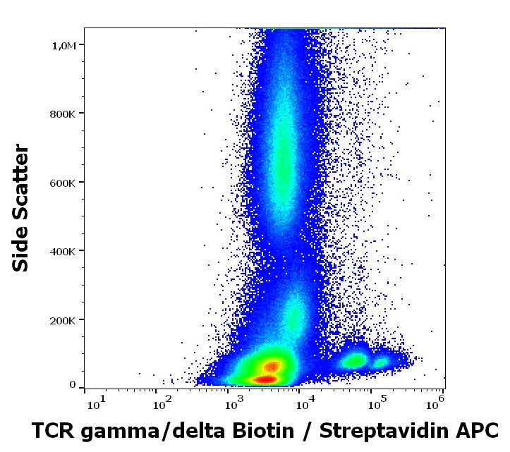 Flow cytometry surface staining pattern of human peripheral whole blood stained using anti-human TCR gamma/delta (B1) Biotin antibody (concentration in sample 15 μg/ml, Streptavidin APC).