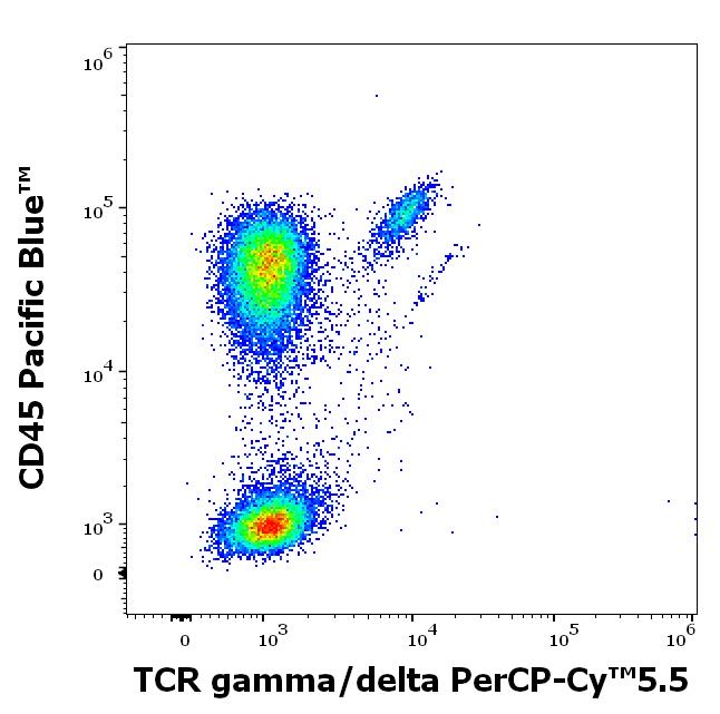 Flow cytometry surface staining pattern of human peripheral whole blood stained using anti-human TCR gamma/delta (B1) PerCP-Cy™5.5 antibody (4 μl reagent / 100 μl of peripheral whole blood).