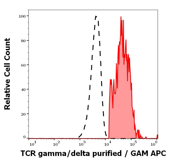 Separation of human TCR gamma/delta positive lymphocytes (red-filled) from TCR gamma/delta negative lymphocytes (black-dashed) in flow cytometry analysis (surface staining) of human peripheral whole blood stained using anti-human TCR gamma/delta (B1) purified antibody (concentration in sample 4 μg/ml) GAM APC.
