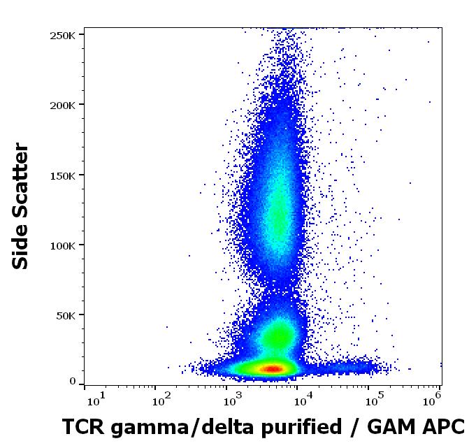 Flow cytometry surface staining pattern of human peripheral whole blood stained using anti-human TCR gamma/delta (B1) purified antibody (concentration in sample 4 μg/ml) GAM APC.