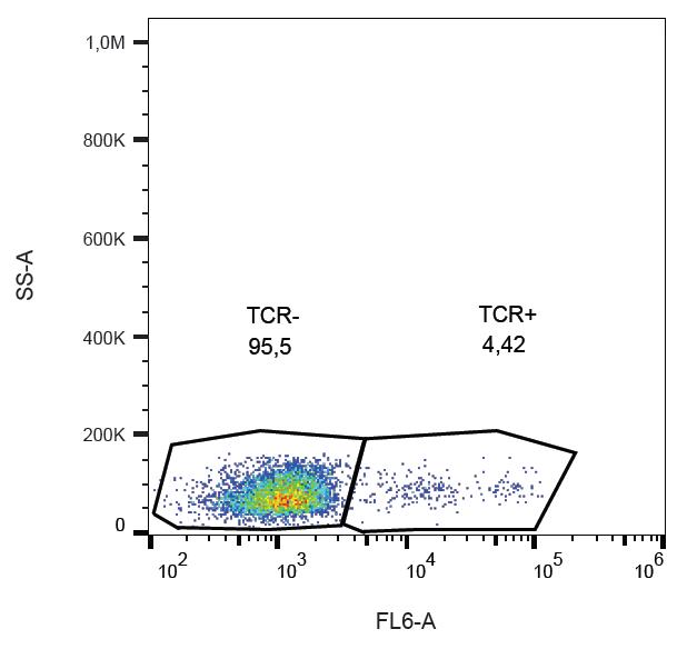 The reactivity of clone B1 (anti-TCR gamma/delta) may be affected by co-staining with an anti-human CD3 mAb, which is likely to block the epitope recognized by clone B1. When using antibody B1 in a panel that includes CD3, it is recommended to apply a staining protocol in which the B1 mAb is added to the sample and incubated for approximately 15 minutes before adding the remaining antibodies. No washing is required between the staining steps.