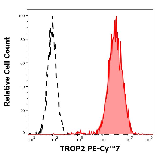 Separation of MCF-7 cells stained using anti-human TROP2 (TrMab-6) PE-Cy™7 antibody (concentration in sample 0.33 μg/ml, red-filled) from MCF-7 cells using mouse IgG1 isotype control (MOPC-21) PE-Cy™7 antibody (concentration in sample 0.33 μg/ml, same as TROP2 PE-Cy™7 concentration, black-dashed) in flow cytometry analysis (surface staining).