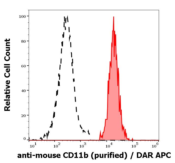 Separation of murine CD11b positive myeloid cells (red-filled) from murine CD11b negative lymphocytes (black-dashed) in flow cytometry analysis (surface staining) of murine splenocyte suspension stained using anti-mouse CD11b (M1/70) purified antibody (concentration in sample 0,6 μg/ml) DAR APC.