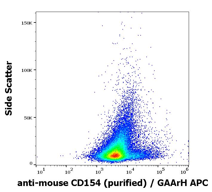 Flow cytometry surface staining pattern of murine stimulated (PMA + Ionomycin) splenocytes stained using anti-mouse CD154 (MR-1) purified antibody (low endotoxin, concentration in sample 3 μg/ml, GAArH APC).