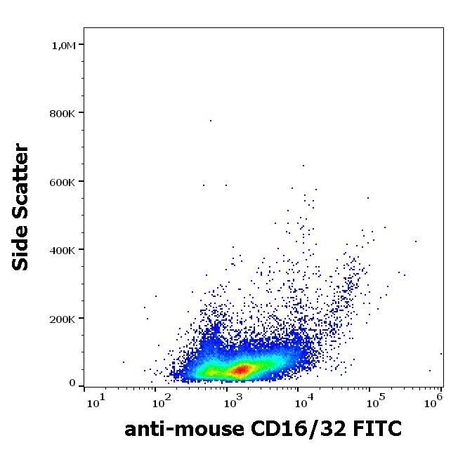 Flow cytometry surface staining pattern of murine splenocyte suspension stained using anti-mouse CD16/32 (93) FITC antibody (concentration in sample 15 μg/ml).