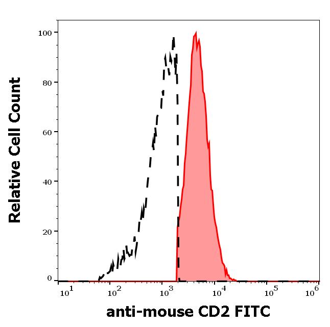 Separation of murine CD2 positive cells (red-filled) from murine CD2 negative cells (black-dashed) in flow cytometry analysis (surface staining) of murine splenocyte suspension using anti-mouse CD2 (RM2-5) FITC antibody (concentration in sample 3 μg/ml).