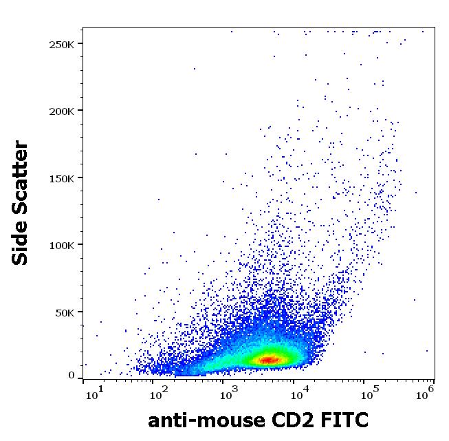 Flow cytometry surface staining pattern of murine splenocyte suspension stained using anti-mouse CD2 (RM2-5) FITC antibody (concentration in sample 3 μg/ml).