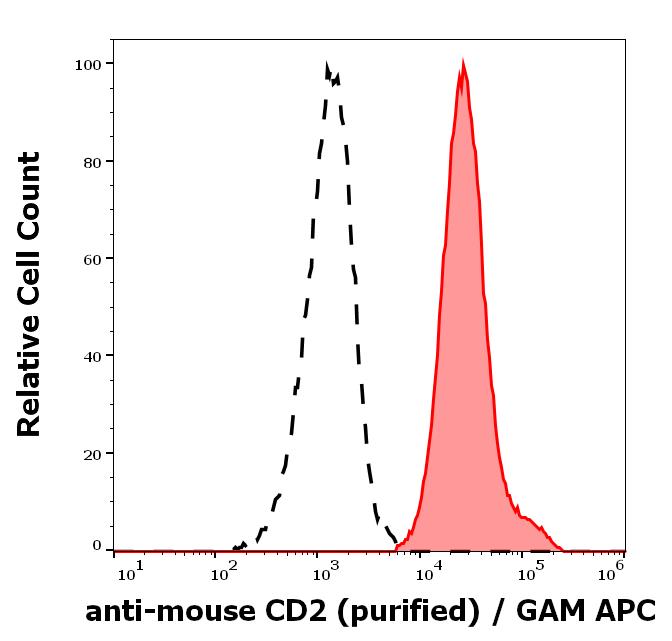 Separation of murine CD2 positive cells (red-filled) from CD2 negative cells (black-dashed) in flow cytometry analysis (surface staining) of murine splenocyte suspension stained using anti-mouse CD2 (RM2-5) purified antibody (concentration in sample 0,44 μg/ml, GAM APC).