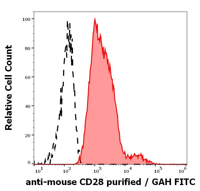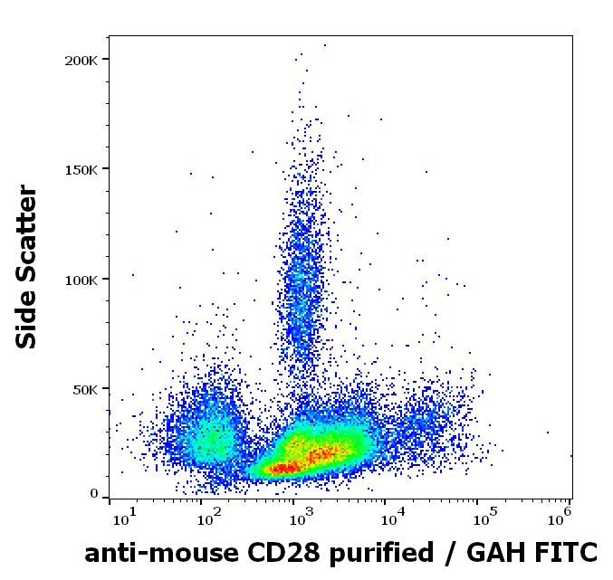 Flow cytometry surface staining pattern of murine peritoneal fluid cells stained using anti-mouse CD28 (37.51) purified antibody (concentration in sample 4 μg/ml, Goat Anti-Hamster FITC).