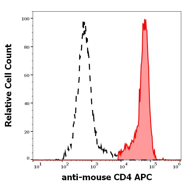 Separation of murine CD4 positive splenocytes (red-filled) from CD4 negative splenocytes (black-dashed) in flow cytometry analysis (surface staining) of murine splenocytes stained using anti-mouse CD4 (GK1.5) APC antibody (concentration in sample 1 μg/ml).