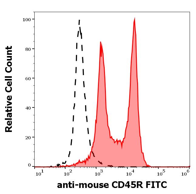 Separation of murine splenocytes stained using anti-mouse CD45R (RA3-6B2) FITC antibody (concentration in sample 1 μg/ml, red-filled) from murine splenocytes unstained by primary antibody (black-dashed) in flow cytometry analysis (surface staining).