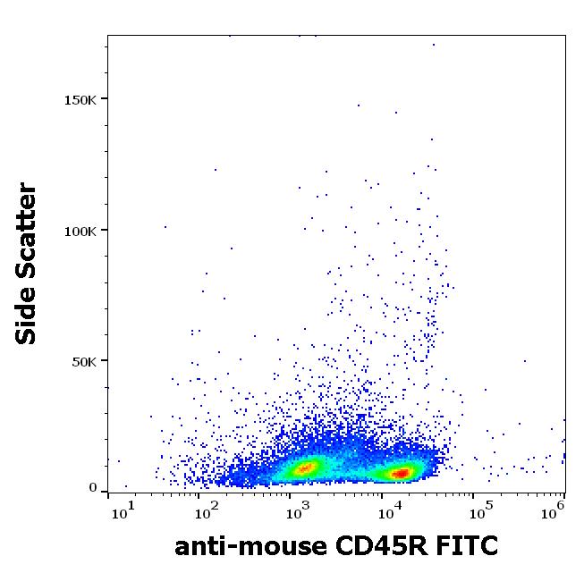 Flow cytometry surface staining pattern of murine splenocyte suspension stained using anti-mouse CD45R (RA3-6B2) FITC antibody (concentration in sample 1 μg/ml).