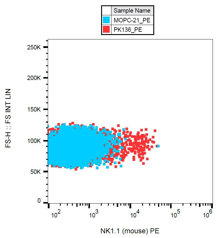 The mouse monoclonal antibody PK136 recognizes an extracellular epitope of NK1.1 antigen (NK cell marker) expressed by some mouse strains (e.g. C57BL/6, NZB, CE, C58, Ma/My), whereas other strains (e.g. BALB/c, AKR, CBA, C3H) do not express this antigen. This antibody detects a conformational epitope on Nkrp1c and Nkrp1b gene products.