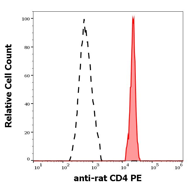 Separation of rat CD4 positive cells (red-filled) from rat CD4 negative cells (black-dashed) in flow cytometry analysis (surface staining) of rat splenocyte suspension stained using anti-rat CD4 (OX-35) PE antibody (concentration in sample 5 μg/ml).