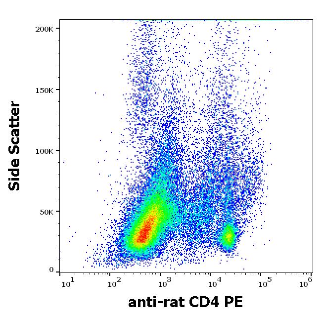 Flow cytometry surface staining pattern of rat splenocyte suspension stained using anti-rat CD4 (OX-35) PE antibody (concentration in sample 5 μg/ml).
