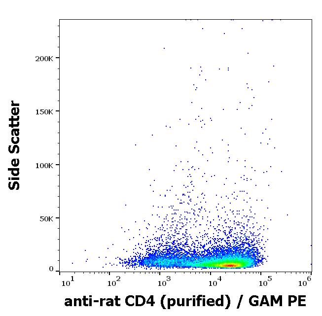 Flow cytometry surface staining pattern of rat splenocytes stained using anti-rat CD4 (OX-35) purified antibody (concentration in sample 1,6 μg/ml, GAM PE).