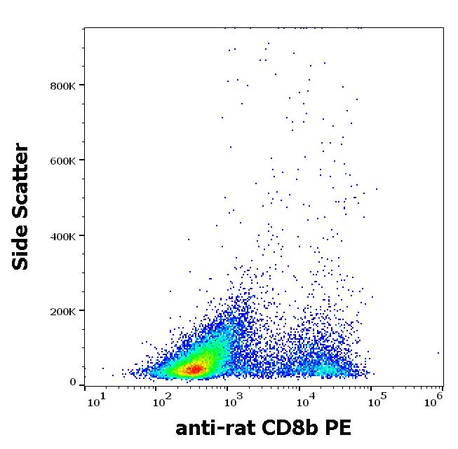 Flow cytometry surface staining pattern of rat splenocyte suspension stained using anti-rat CD8b (341) PE antibody (concentration in sample 3 μg/ml).