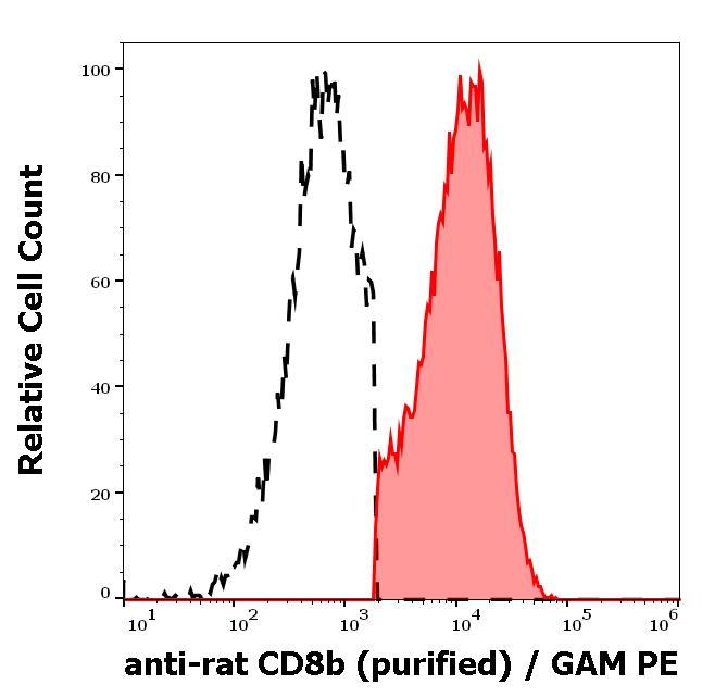 Separation of murine CD8b positive cells (red-filled) from CD8b negative cells (black-dashed) in flow cytometry analysis (surface staining) of murine splenocyte suspension stained using anti-rat CD8b (341) purified antibody (concentration in sample 1 μg/ml, GAM APC).