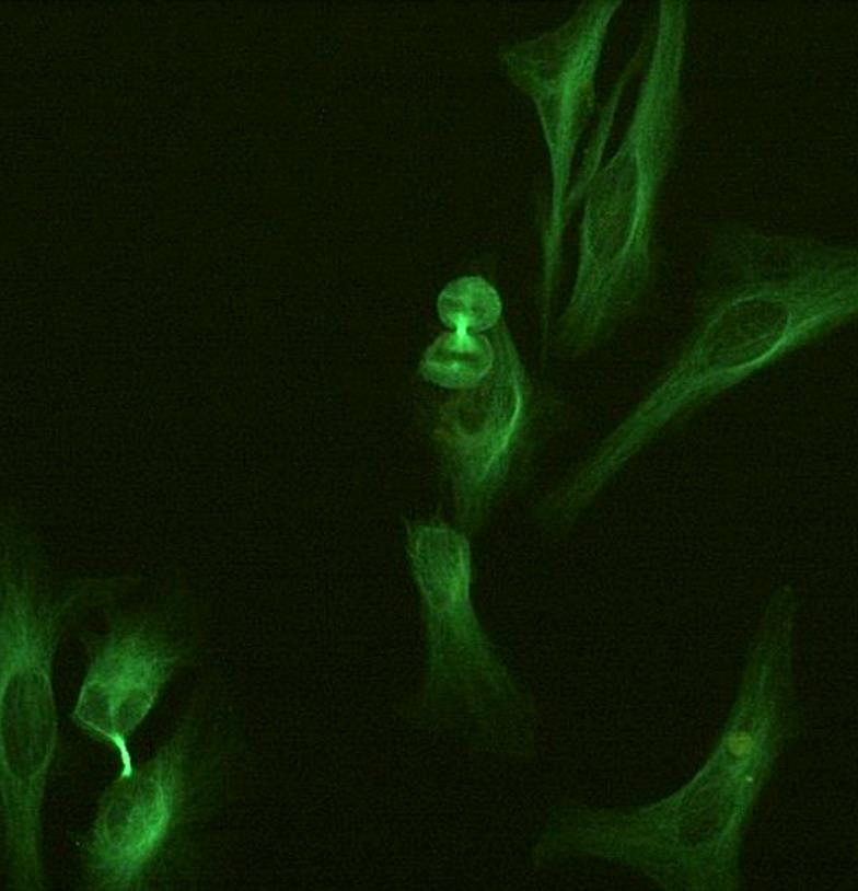 Immunocytochemistry staining of alpha tubulin in HeLa cells by mouse monoclonal antibody YOL1/34 conjugated with Alexa Fluor 488 (4 μg/ml; green).