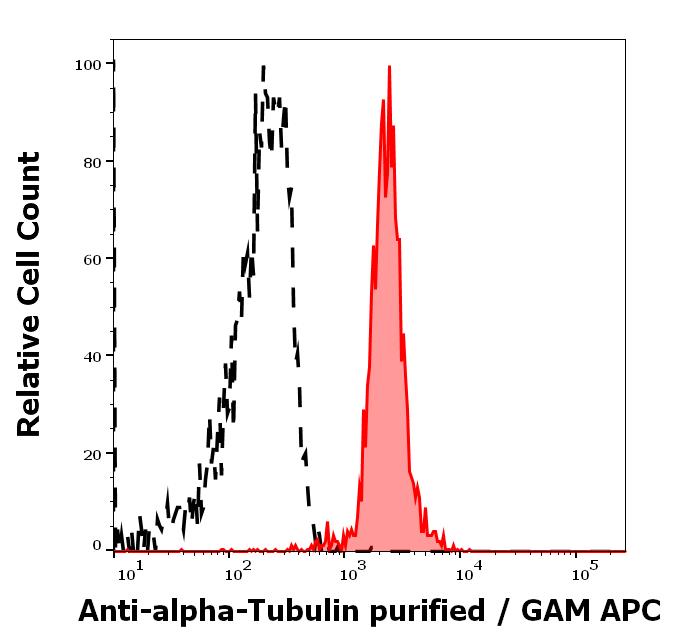 Separation of human monocytes stained using anti-alpha-tubulin (YOL1/34) purified antibody (concentration in sample 8 μg/ml, GAM APC, red-filled) from monocytes stained using mouse IgG1 isotype control (MOPC-21) purified antibody (concentration in sample 8 μg/ml, same as alpha-tubulin purified, GAM APC, black-dashed) in flow cytometry analysis (intracellular staining).