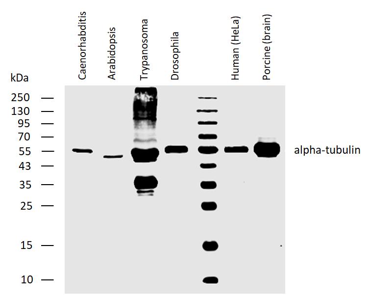 Western blotting analysis of human alpha-tubulin using rat monoclonal antibody YOL1/34 on lysates of Caenorhabditis elegans, Arabidopsis thaliana, Trypanosoma brucei, Drosophila melanogaster, human HeLa cell line, and porcine brain, all under reducing conditions. Each lane contains 20 μg of total protein. Nitrocellulose membrane was probed with 2 µg/ml of rat anti-alpha-tubulin monoclonal antibody followed by IRDye800-conjugated anti-rat secondary antibody.