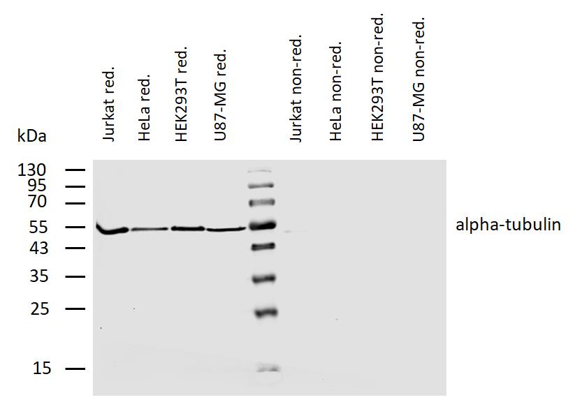 Western blotting analysis of human alpha-tubulin using rat monoclonal antibody YOL1/34 on lysates of various cell lines under reducing and non-reducing conditions. Nitrocellulose membrane was probed with 2 µg/ml of rat anti-alpha-tubulin monoclonal antibody followed by IRDye800-conjugated anti-rat secondary antibody. A specific band was detected for alpha-tubulin at approximately 54 kDa.
