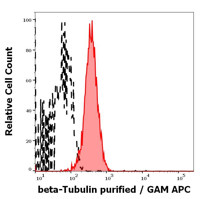 Separation of MCF-7 cells stained using anti-beta Tubulin (TU-12) purified antibody (concentration in sample 8 μg/ml, GAM APC, red-filled) from MCF-7 cells unstained by primary antibody (GAM APC, black-dashed) in flow cytometry analysis (intracellular staining).