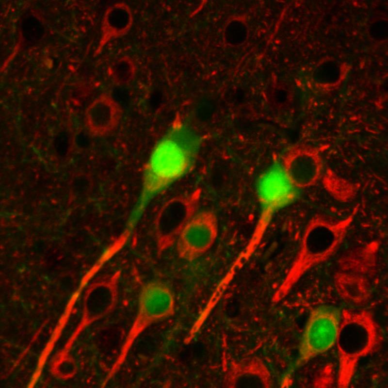 Immunohistochemistry staining of betaIII tubulin (red) in tissue sections of murine brain expressing GFP in some of its neurons (green). Mouse monoclonal antibody TU-20 (anti-betaIII tubulin) was detected with goat anti-mouse IgG1 conjugated with Alexa Fluor 555.