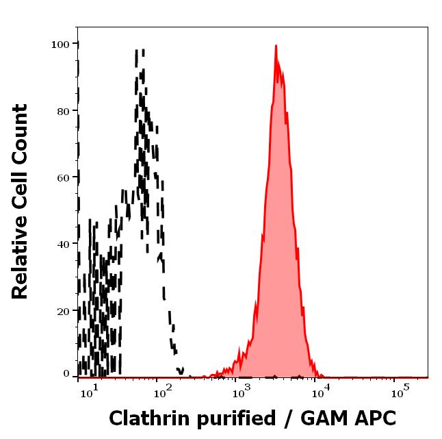 Separation of MCF-7 cells stained using anti-Clathrin (BF-06) purified antibody (concentration in sample 2 μg/ml, GAM APC, red-filled) from MCF-7 cells unstained by primary antibody (GAM APC, black-dashed) in flow cytometry analysis (intracellular staining).