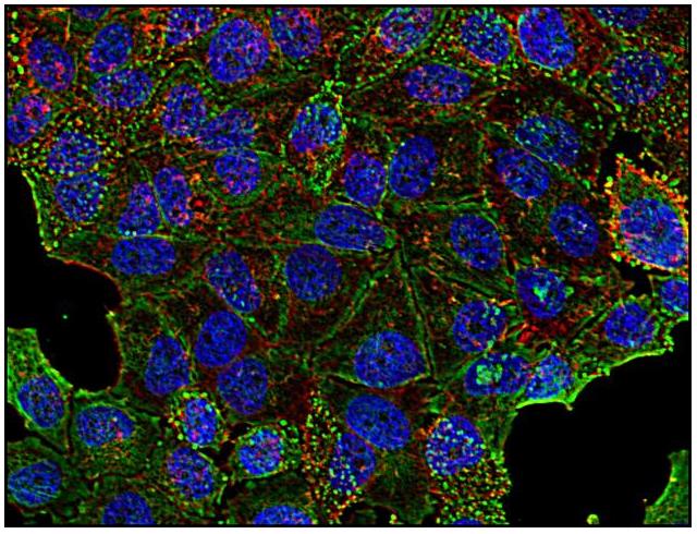 Immunocytochemistry staining of clathrin in human HeLa cell line using anti-clathrin (BF-06; green). Actin cytoskeleton decorated by phalloidin (red) and cell nuclei stained with DAPI (blue).