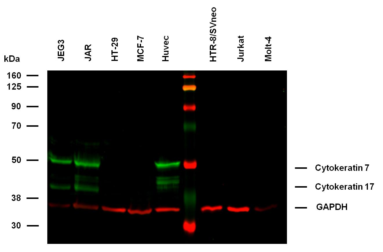 Cytokeratin 7 was detected at ~50 kDa and cytokeratin 17 at ~43 kDa in the respective cell lines.