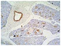 Immunohistochemistry (paraffin sections): Recommended dilution: 10 μg/ml, pretreatment: 0,1% pepsin, 30 min, 37°C, incubation 4°C overnight, chromogen DAB; positive tissue: pancreas.