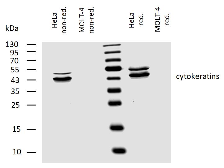 Western blotting analysis of human cytokeratins using mouse monoclonal antibody C-11 on lysates of HeLa cell line and MOLT-4 cell line (cytokeratin non-expressing cell line; negative control) under non-reducing and reducing conditions. Nitrocellulose membrane was probed with 2 µg/ml of mouse monoclonal antibody anti-cytokeratins followed by IRDye800-conjugated anti-mouse secondary antibody. Specific bands were detected for cytokeratins at approximately 45-55 kDa.