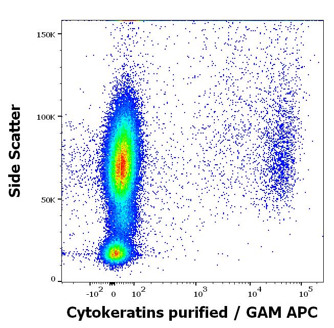 Flow cytometry intracellular staining pattern of human peripheral whole blood spiked with MCF-7 cells stained using anti-Cytokeratins (C-11) purified antibody (concentration in sample 3 μg/ml, GAM APC).