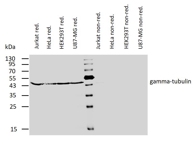 Western blotting analysis of human gamma-tubulin using mouse monoclonal antibody TU-32 on lysates of various cell lines under reducing and non-reducing conditions. Nitrocellulose membrane was probed with 2 µg/ml of mouse anti-gamma-tubulin monoclonal antibody followed by IRDye800-conjugated anti-mouse secondary antibody. A specific band was detected for gamma-tubulin at approximately 46 kDa.