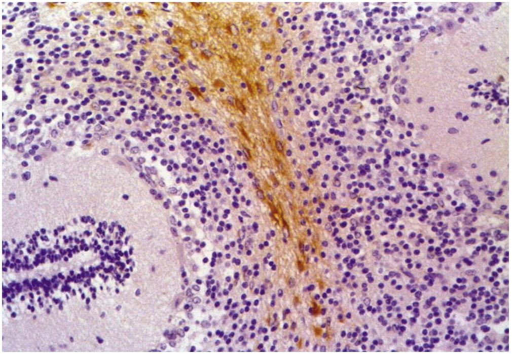 Immunohistochemistry staining of human cerebellum (paraffin-embedded sections) with anti-GFAP (clone GF-01).