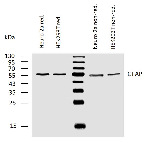 Western blotting analysis of human GFAP using mouse monoclonal antibody GF-02 on lysates of Neuro 2a and HEK 293T cells under reducing and non-reducing conditions. Nitrocellulose membrane was probed with 2 µg/ml of mouse anti-GFAP monoclonal antibody followed by IRDye800-conjugated anti-mouse secondary antibody. A specific band was detected for GFAP at approximately 54 kDa.