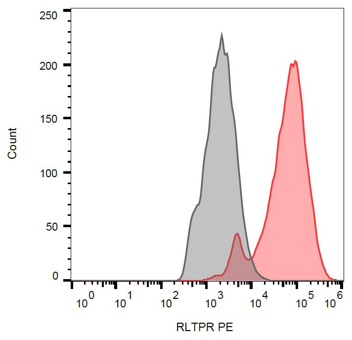 Separation of RLTPR transfected cells stained using anti-RLTPR (EM-53) PE antibody (concentration in sample 27 μg/ml, red) from unstained RLTPR transfected cells (black) in flow cytometry analysis (intracellular staining).